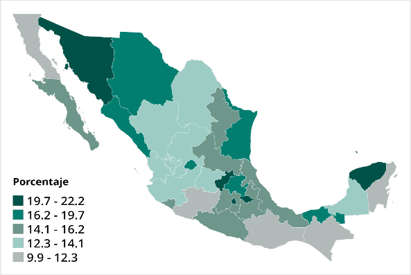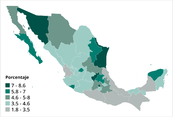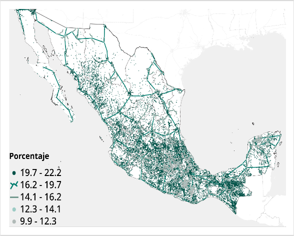 El Mapa siguiente muestra la prevalencia del uso de internet a nivel estatal para interactuar con el gobierno. Como se puede observar, la región Centro-Sur del país (Veracruz Ignacio de la Llave, Guerrero, Oaxaca y Chiapas), así como Nayarit y Michoacán, reportan los niveles más bajos a nivel nacional, con entre 1.8% y 3.5% de la población, lo que ilustra las desigualdades estructurales en el país.