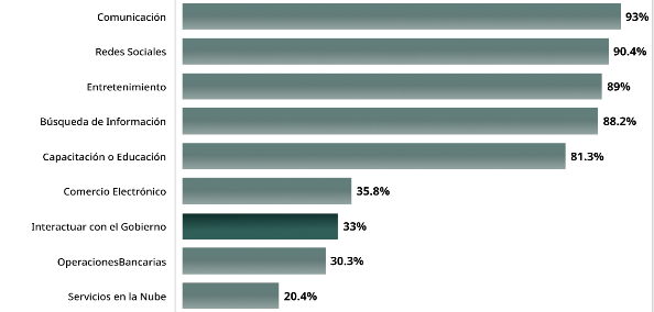 A lo largo de su vida, las y los mexicanos se enfrentan a la necesidad de realizar diversos trámites en la APF, así como en los niveles estatal y municipal. El 33% de las y los mexicanos reportó la interacción con el gobierno como uno de los principales usos que le dan al internet (Gráfica 2). Ello les condujo a interactuar con un sistema complejo, disperso, heterogéneo, con multiplicidad de requisitos no homologados entre entidades y a través de procesos largos y con diversos espacios de discrecionalidad por parte de personas servidoras públicas. Conforme a los resultados de la ENCIG, en 2023 el 83.1% de la población consideró frecuente la corrupción y 14.0 % la experimentó al realizar trámites, pagos, solicitudes de servicios, o al tener contacto con alguna persona servidora pública. Ese mismo año, el 16.2 % de los pagos, trámites o solicitudes de servicios públicos se realizó por internet, un aumento de 1.8 puntos porcentuales con respecto a 2021 (ENCIG, 2023).