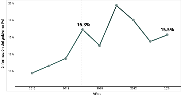 Gráfica 3. Porcentaje anual de personas que usan internet para consultar información de gobierno, de 2015 a 2024